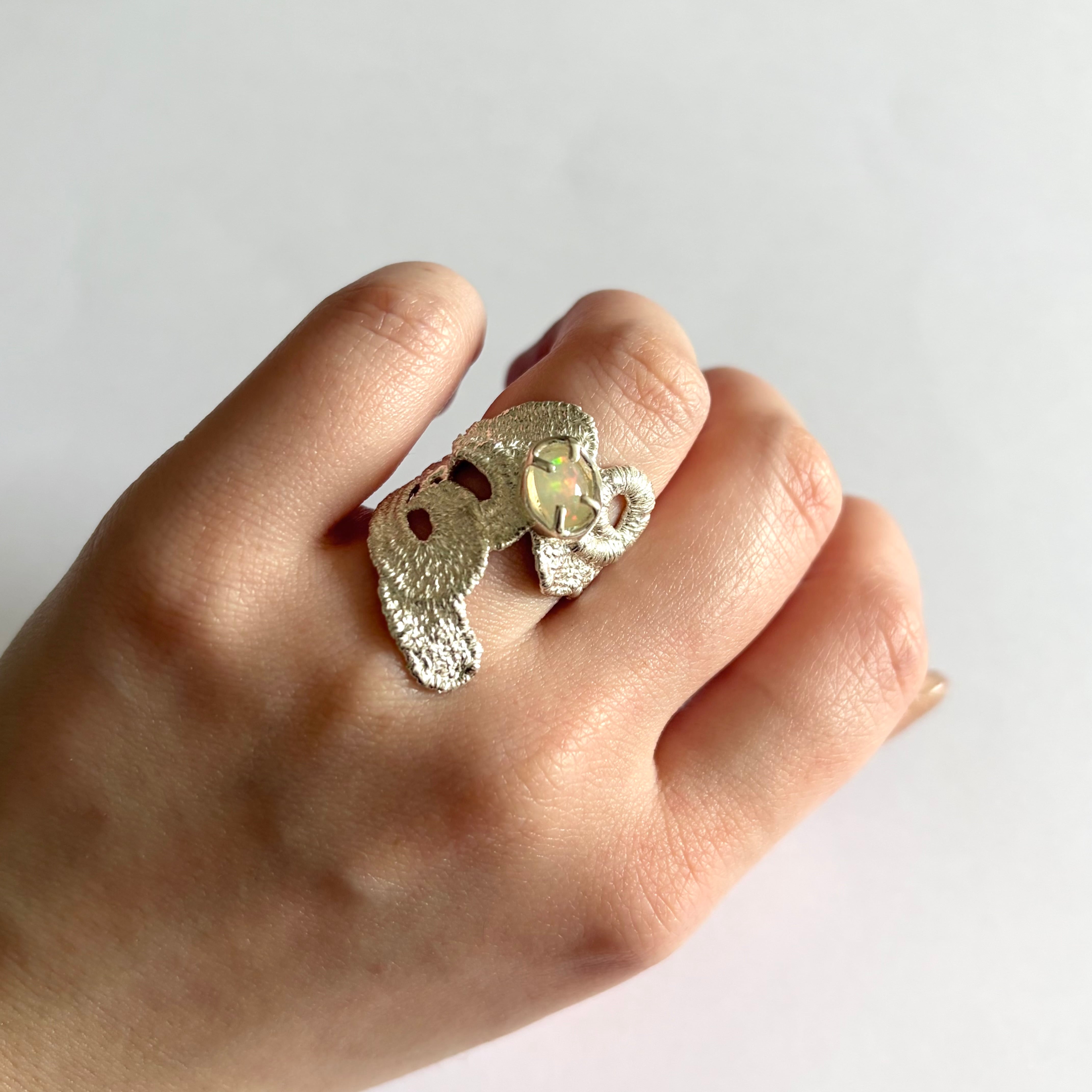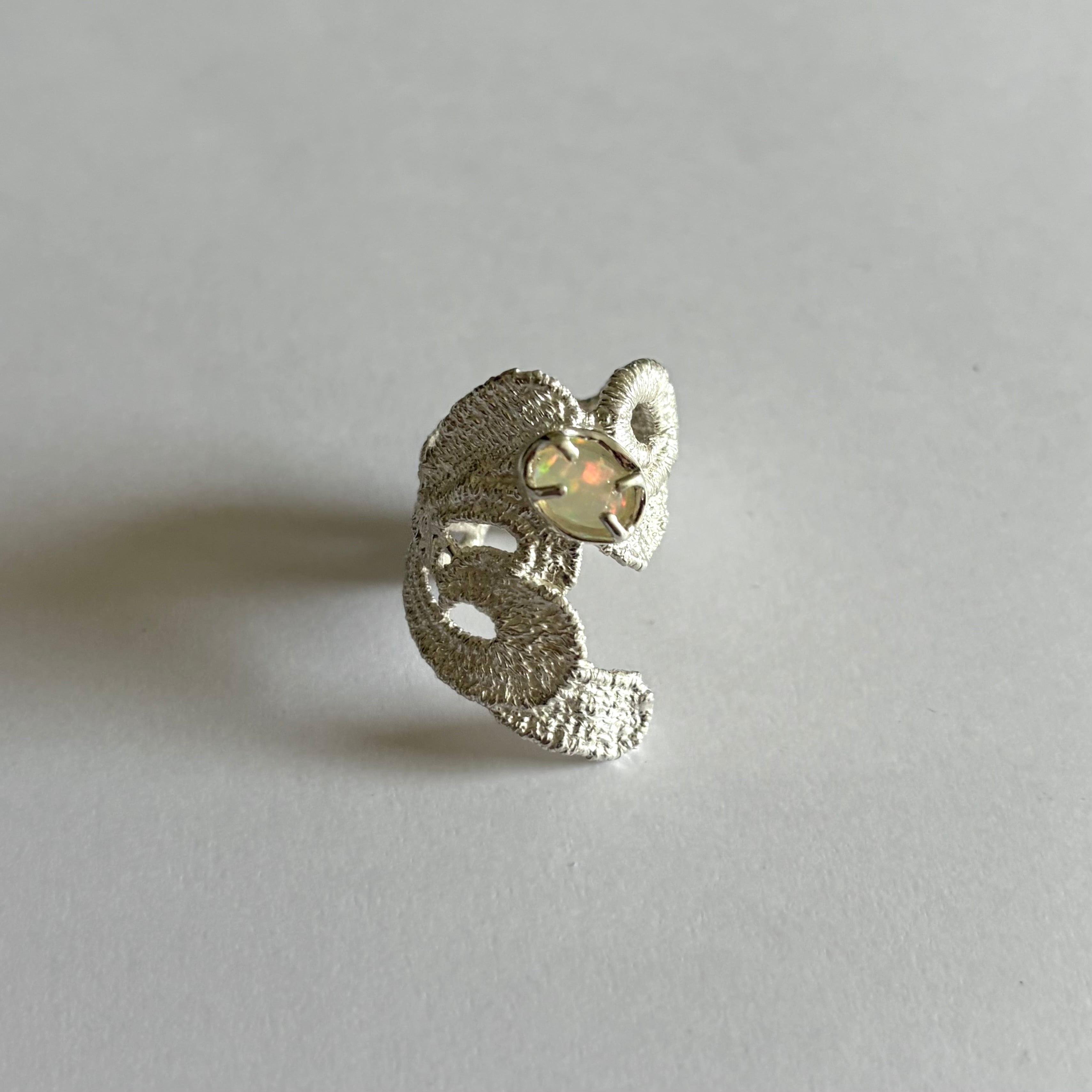 レースを鋳造したリング。やわらかな曲線の透け感と立体的なテクスチャーが、指先に軽やかな存在感をつくります。