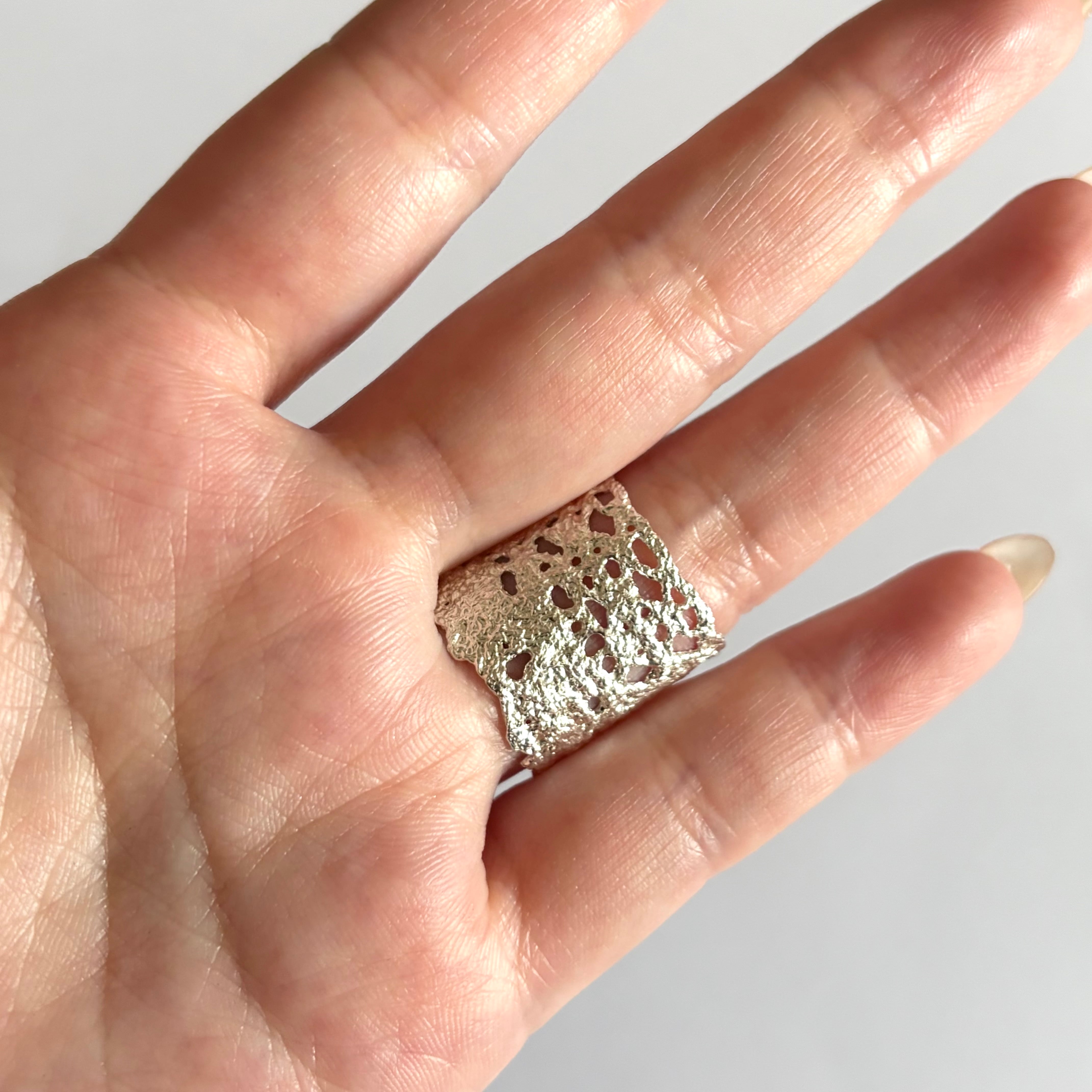 レースを鋳造したリング。やわらかな曲線の透け感と立体的なテクスチャーが、指先に軽やかな存在感をつくります。